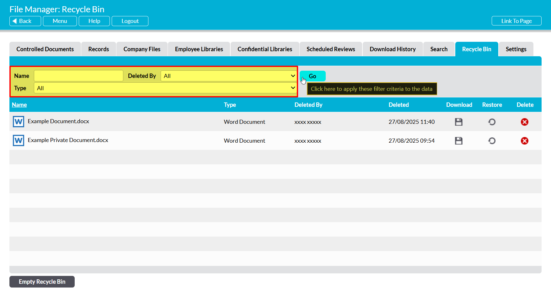 You will be prompted to confirm whether your Recycle Bin should be emptied. Click on Ok, and all files that are currently held within the Recycle Bin will be cleared from the register and permanently removed from your system. In addition, new entries will automatically be made within your system’s Deletion Log to provide an audit trail of each file’s deletion.