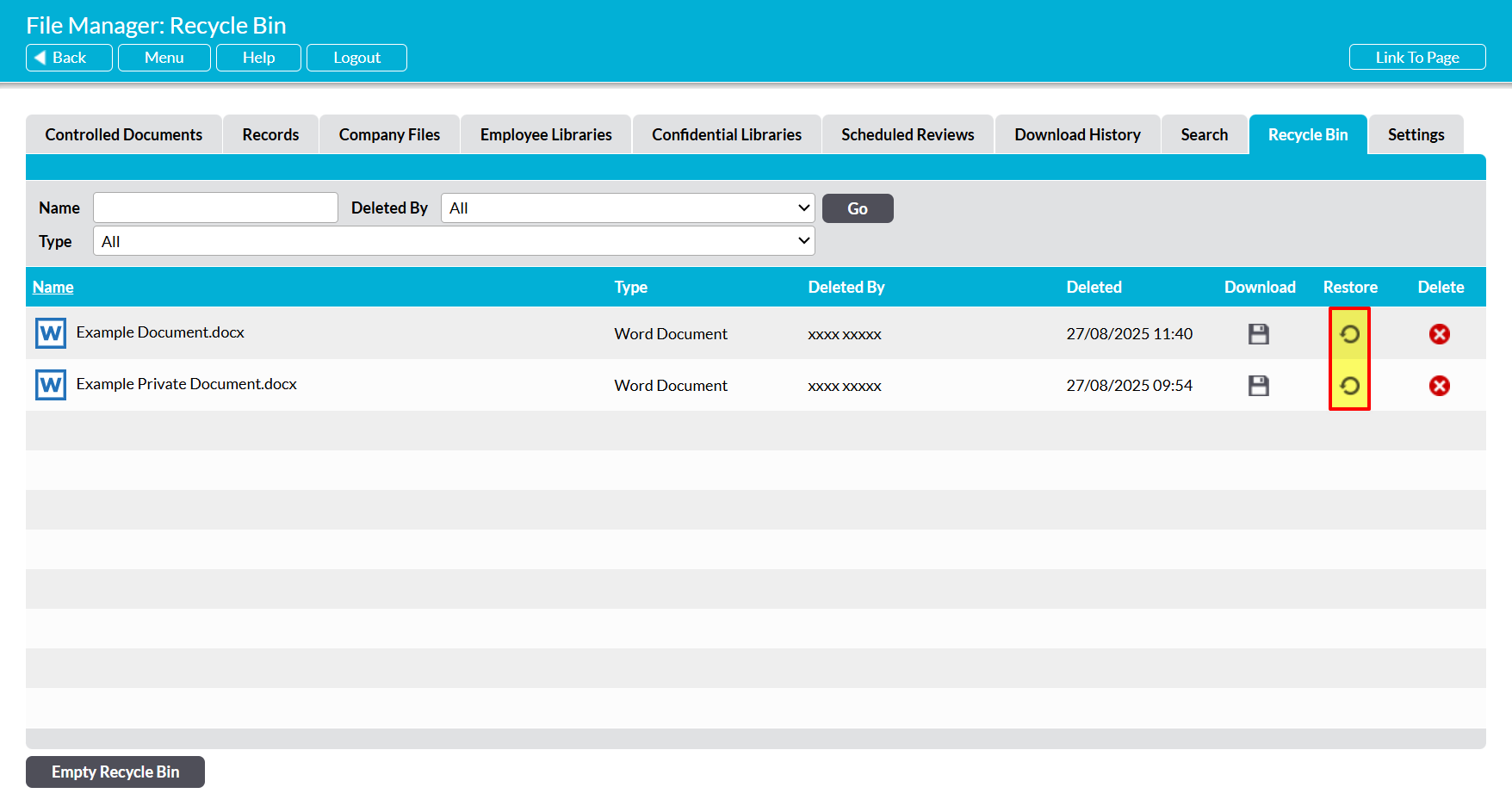 The Recycle Bin is available to any user who has ‘Admin’ permissions to the System Administration: Administrator permissions area. Any user who has access to the Recycle Bin can: