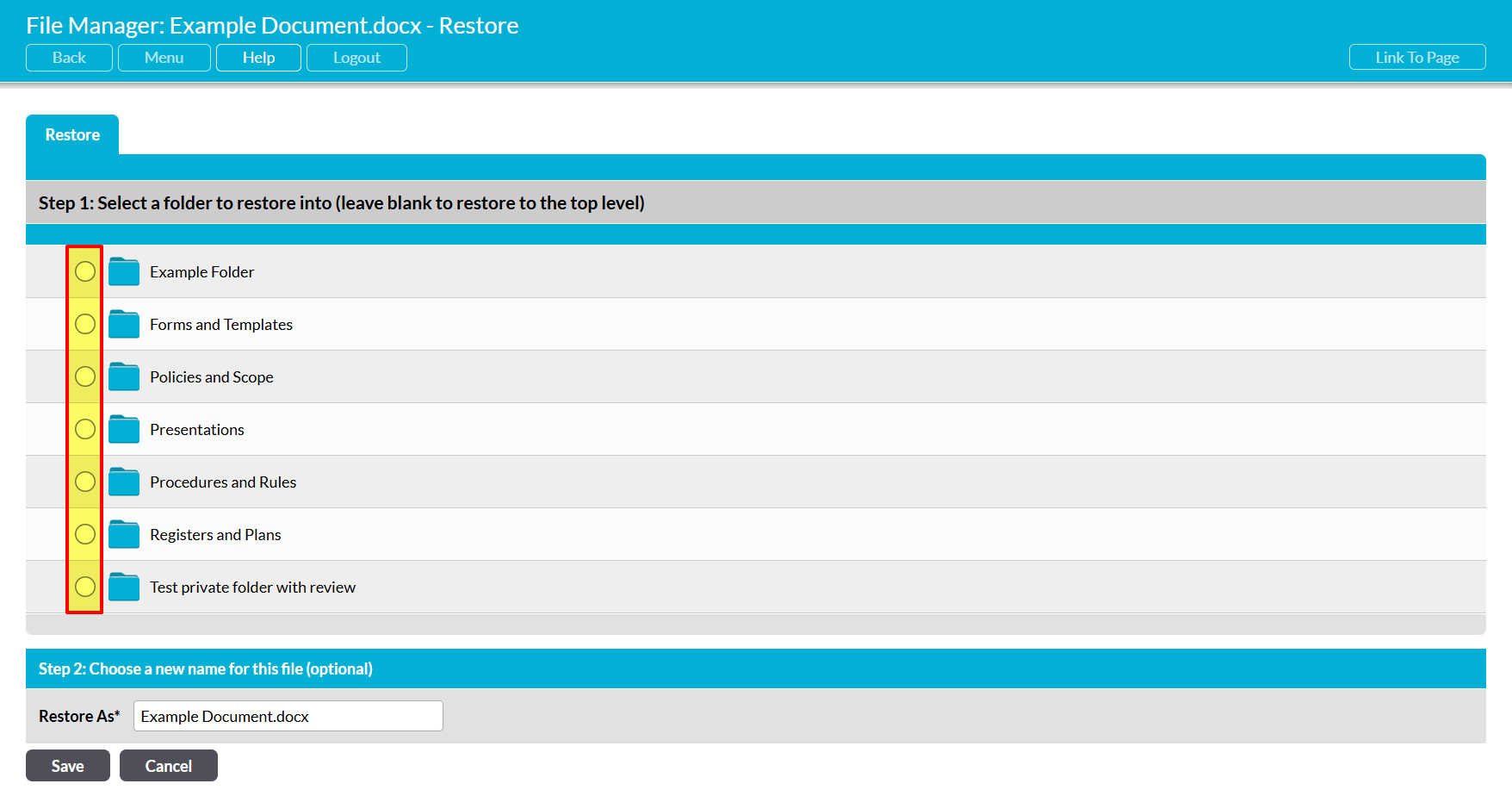 Activ will open the Restore page, which will present you with the file structure for the Library that the file was originally housed within. Use the radio button to the left of the appropriate folder to select the folder that the file should be restored to, or leave your selection blank to restore it directly to the root of the Library.