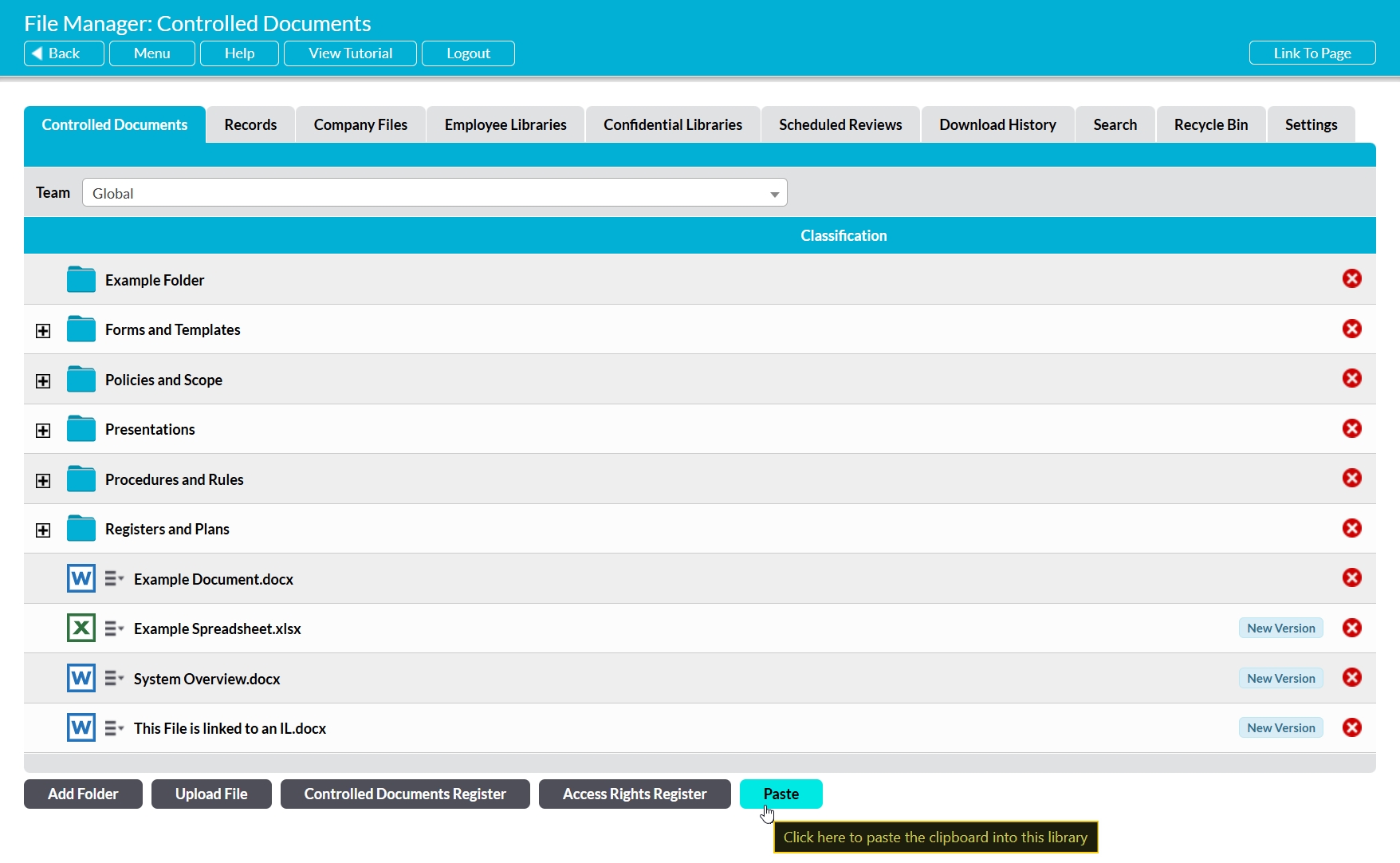The copied folder and its contents (subfolders and files) will be pasted into your chosen location. All files within the copy will be set to Version 1, and their Download History tabs will show that they have not yet been downloaded by any user in your system.