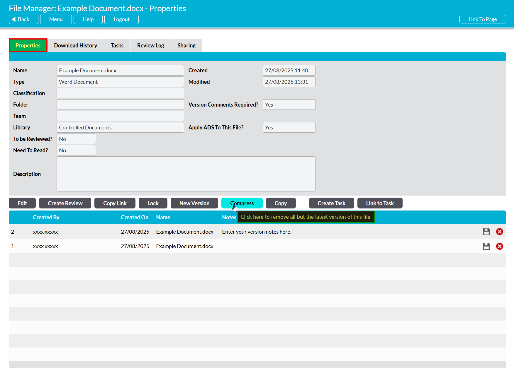 If you have ‘Admin’ permissions to the appropriate Library, Activ provides you with the option to compress your files and regain storage space within your system. Compressing a file preserves the latest version of the file but deletes all previous versions from the file’s version register, meaning that you will not be able to view or restore these earlier versions. In addition, the latest version of the file will be marked as version one, making it appear as if previous versions have not existed. This feature is most commonly used when a consultant has been assisting you with the initial setup of your system and needs to mark the updated Activ templates as version one.