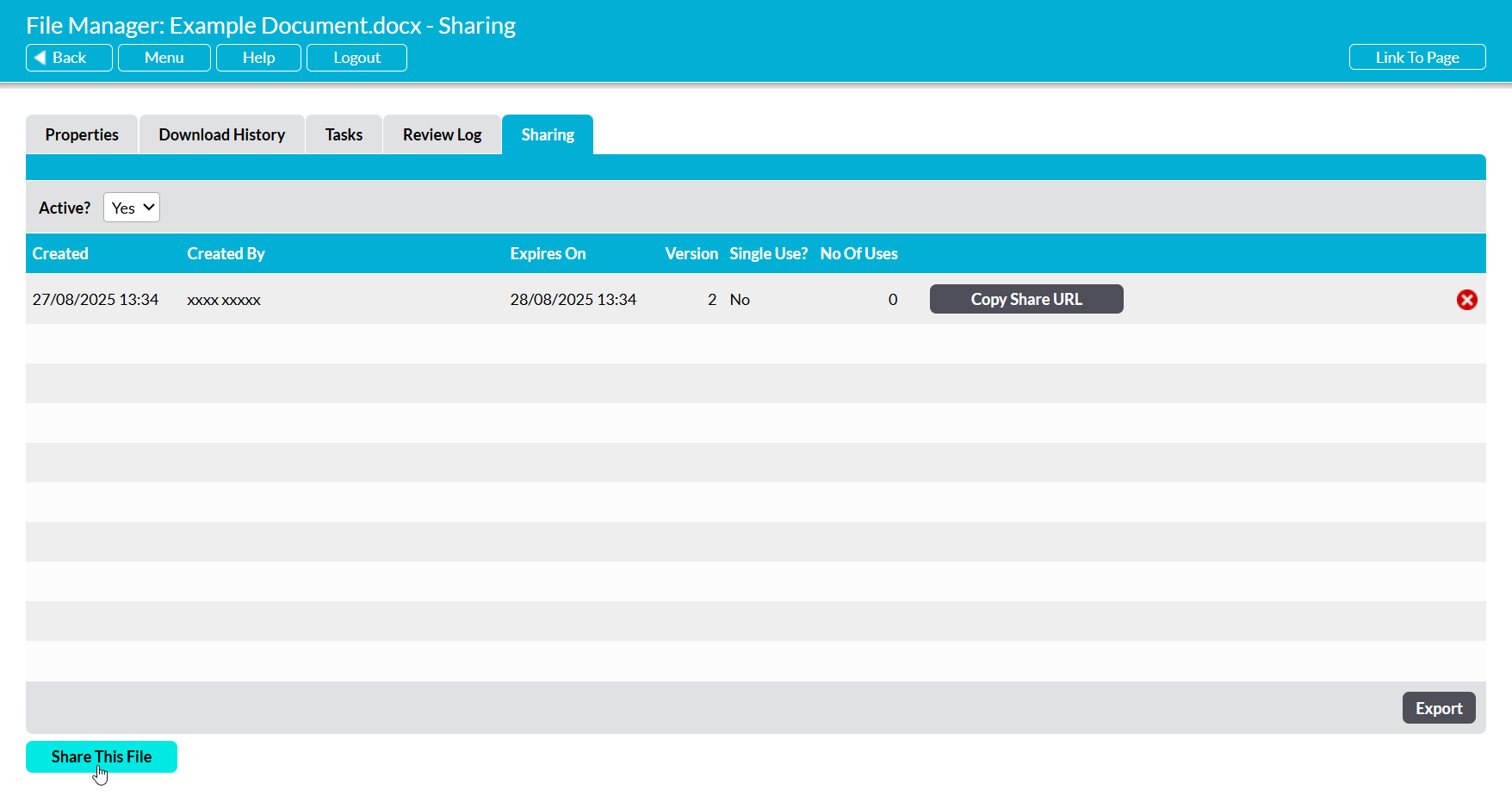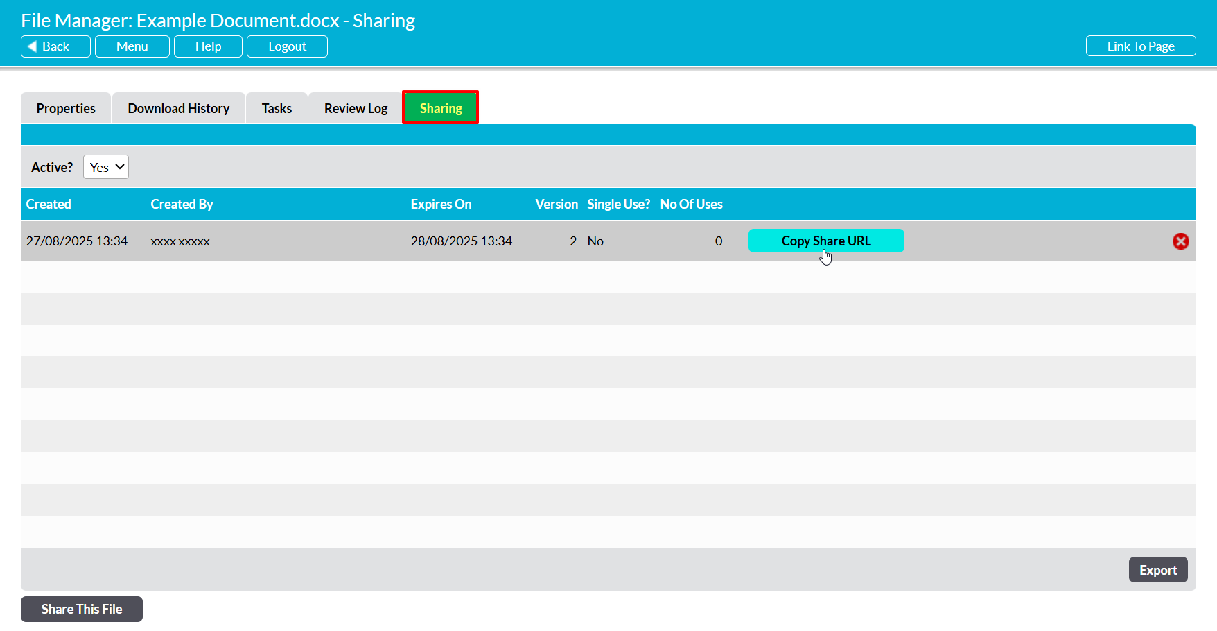 To share a file, open the file on its Properties (see View a File’s Properties) and click on its Sharing tab. Activ will open a register of all currently active share links that have been generated for the file. If the file already has an active share link, and it is appropriate to re-use it for your intended recipient, then click on the Copy Share URL button displayed within the existing link’s row.
