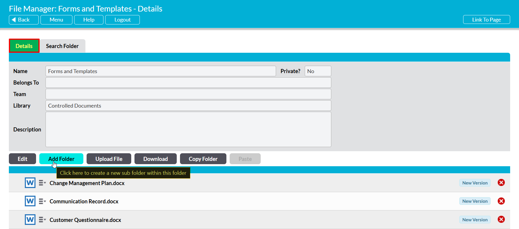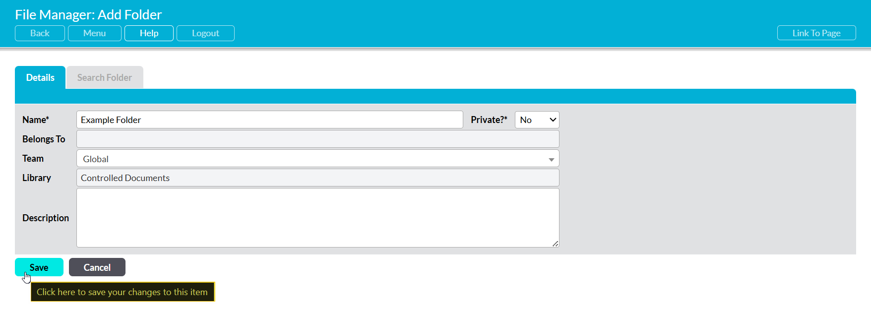 Relates To – only applicable if the folder is in a company or employee Library, in which case this field is automatically populated with the relevant company or employee name. It will be blank if the folder is being added to Records or Controlled Documents.