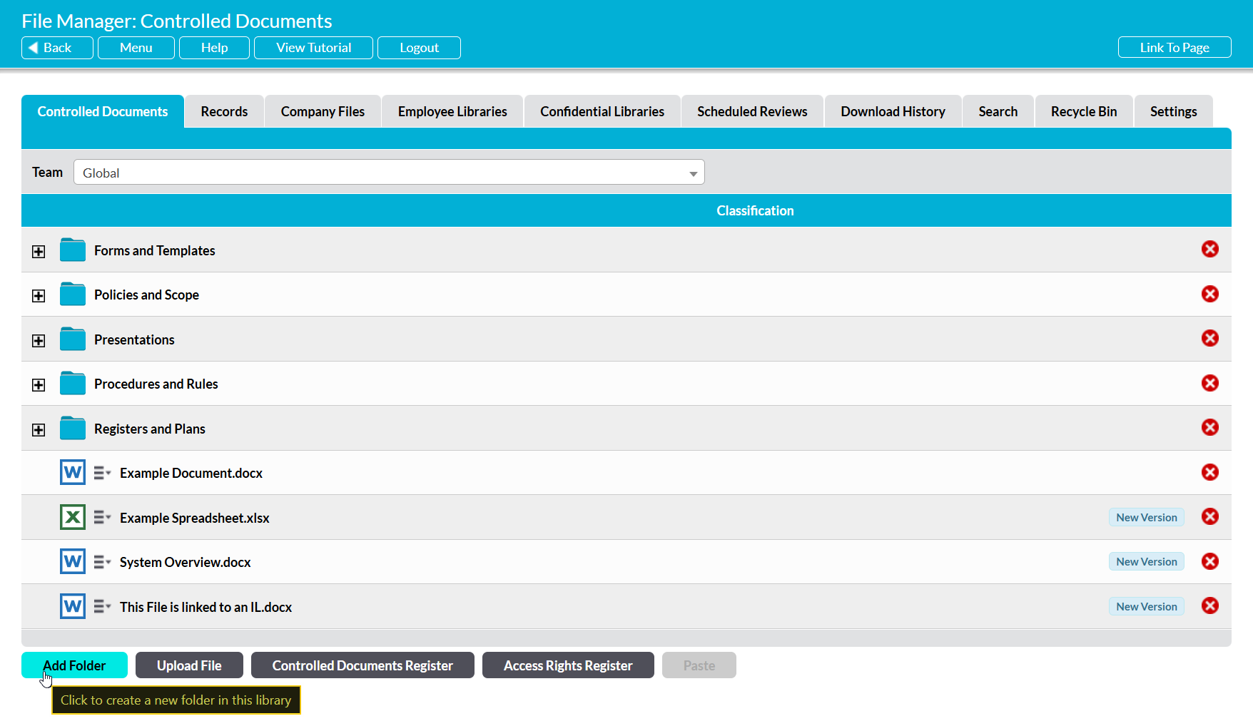 To assist you in organising your files, Activ allows you to create a custom folder structure within all of the File Manager’s Libraries. In some instances, your system will start with a predefined structure already entered into your Records and Controlled Documents Libraries, but your Company Files, Confidential Libraries, and Employee Libraries will initially be empty.