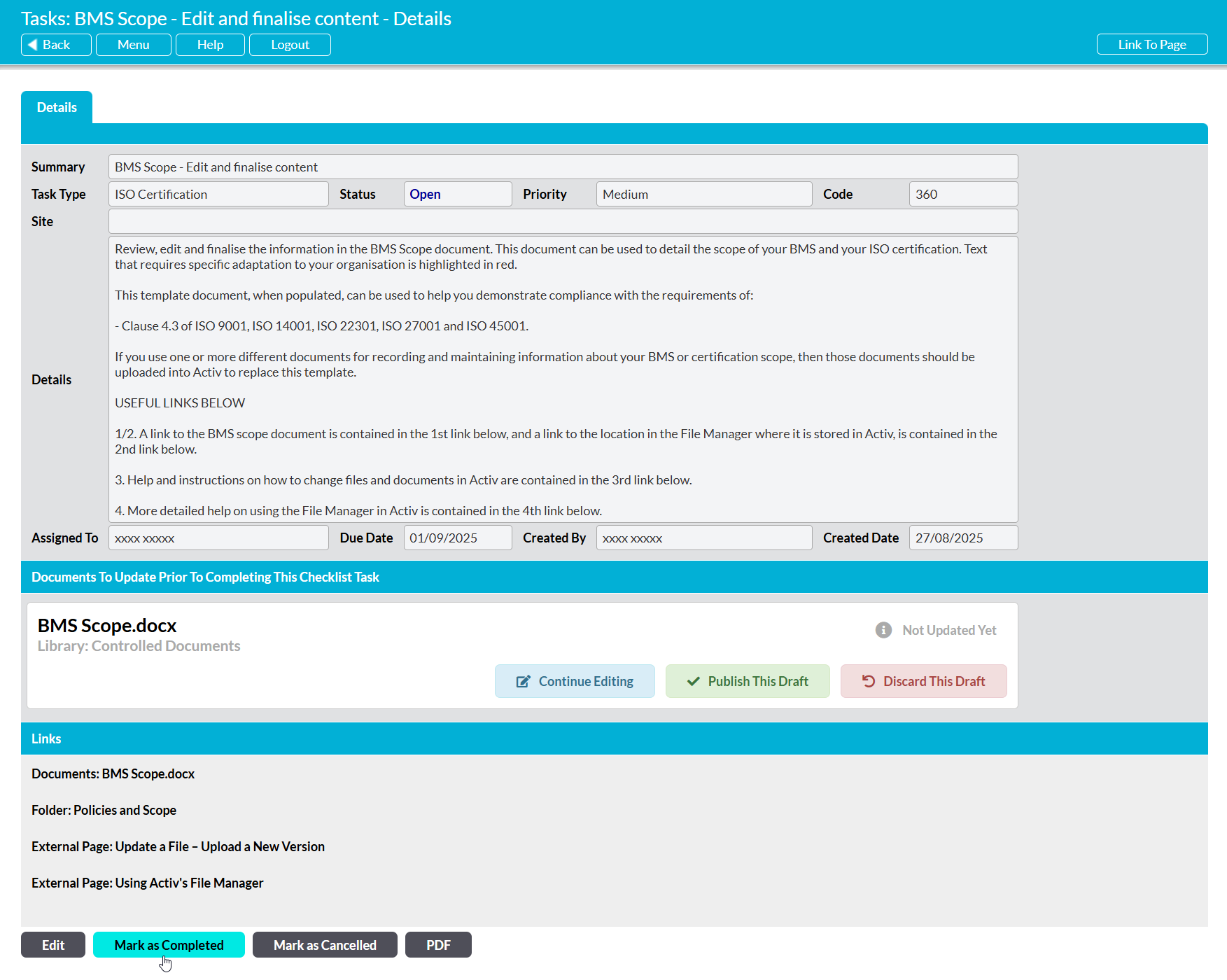 Alternatively, open the ISO Task and click on the Mark as Completed button within its Details.