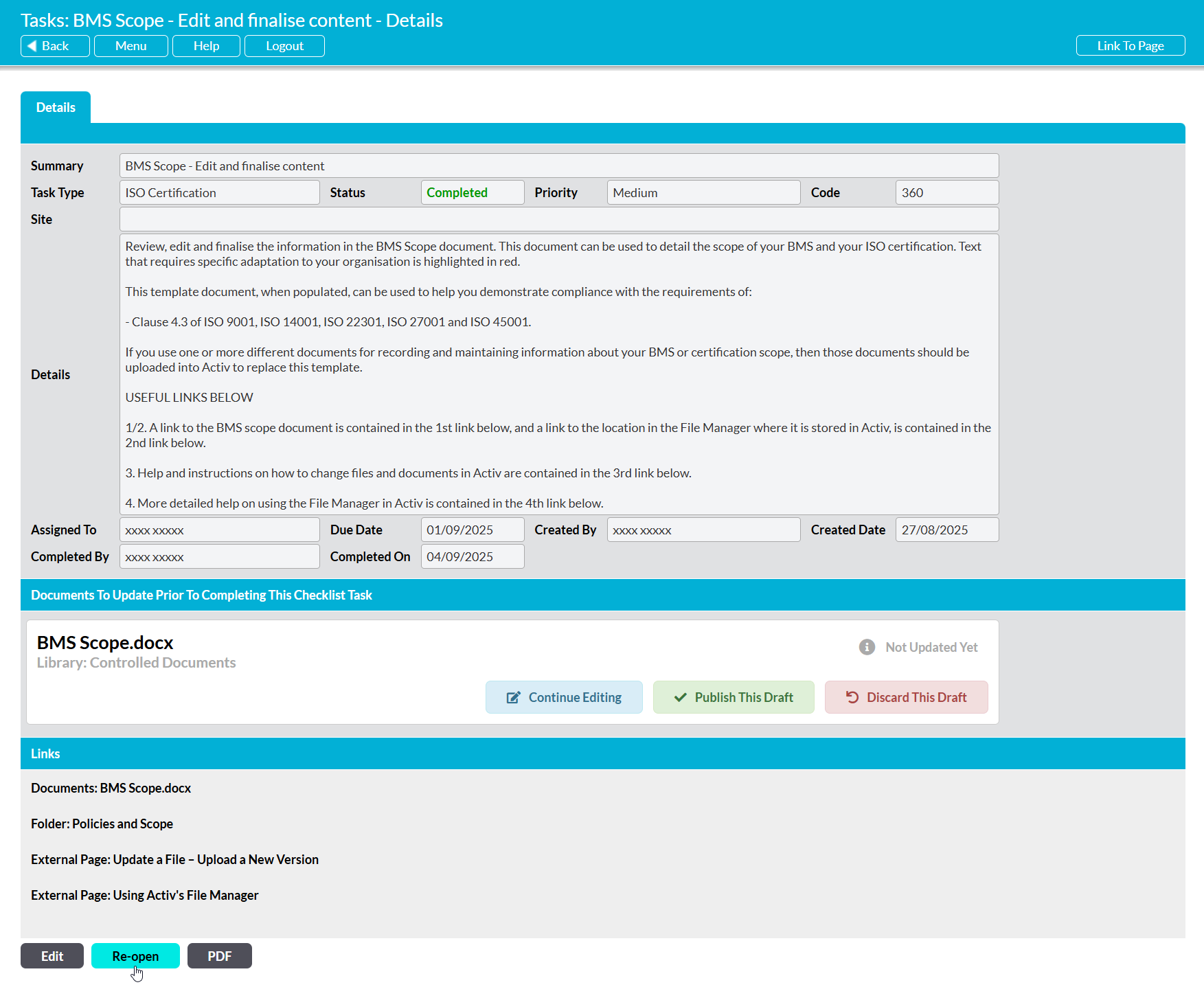 If you need to re-open an ISO Task, then locate the relevant Task within the Task Checklist, and click on the Re-open button displayed on its tile (or alongside its record, if you are using List view).
