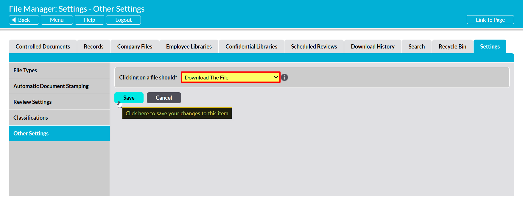 The settings area will open for editing. Locate the Clicking on a File Should option and use the dropdown menu to select between ‘Download’ and ‘Preview’, noting that the available options will result in the following behaviour: