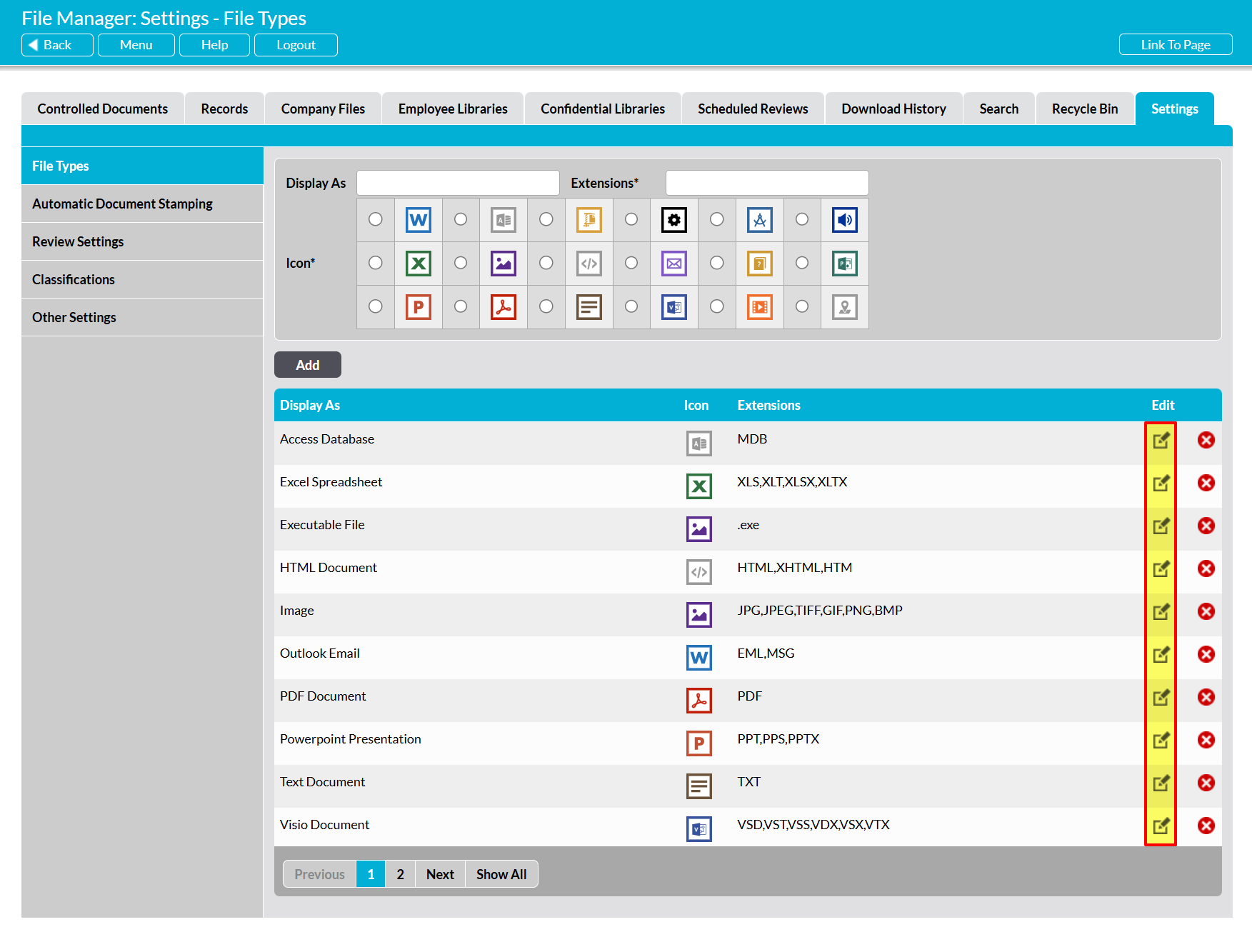 Note that removing or editing the pre-set extensions may prevent you from uploading or downloading any files that have that extension. As such you should exercise caution when editing the file types that are recorded in your system.
