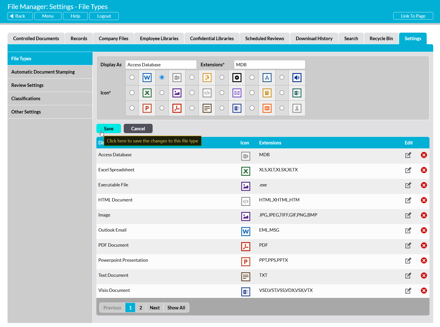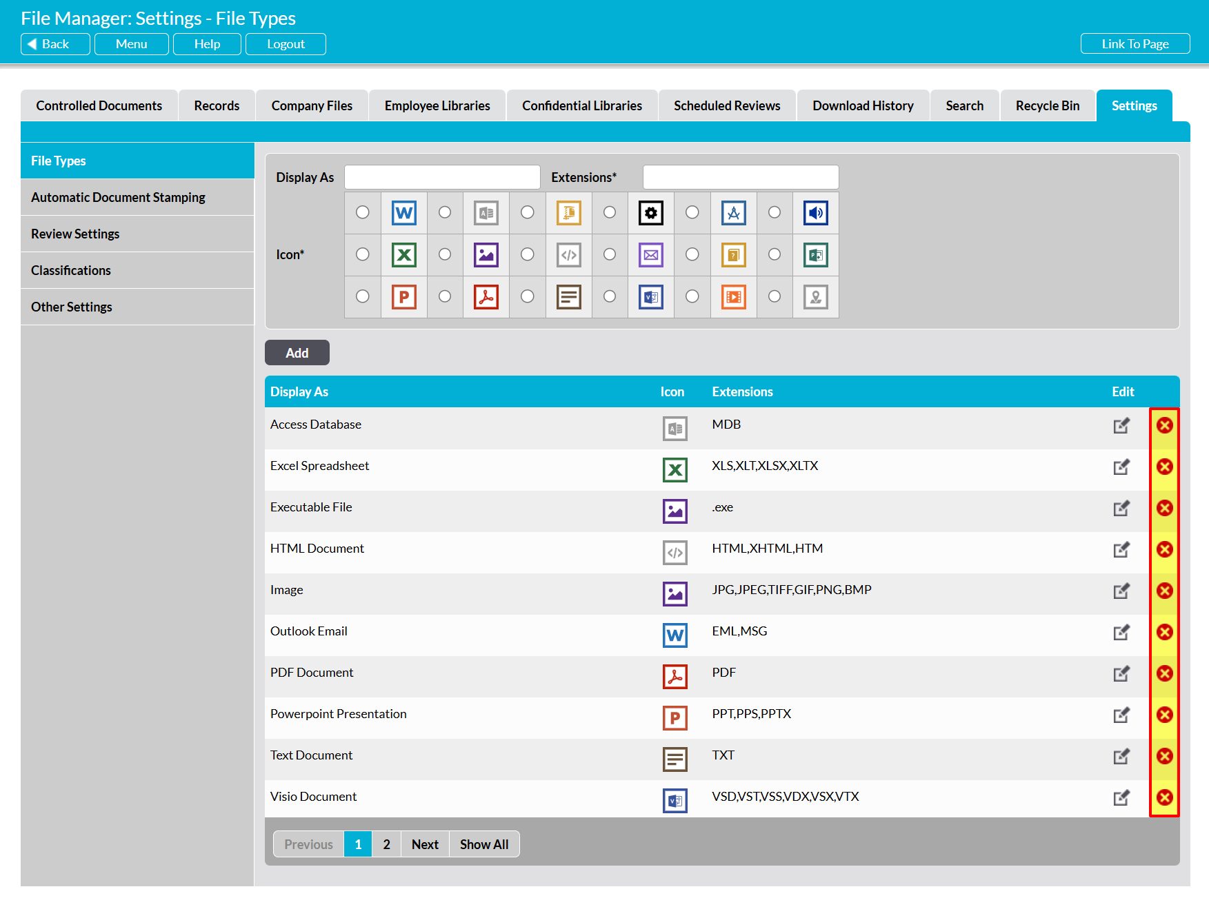 To delete a file type from the list, locate its record and click on the red cross icon.