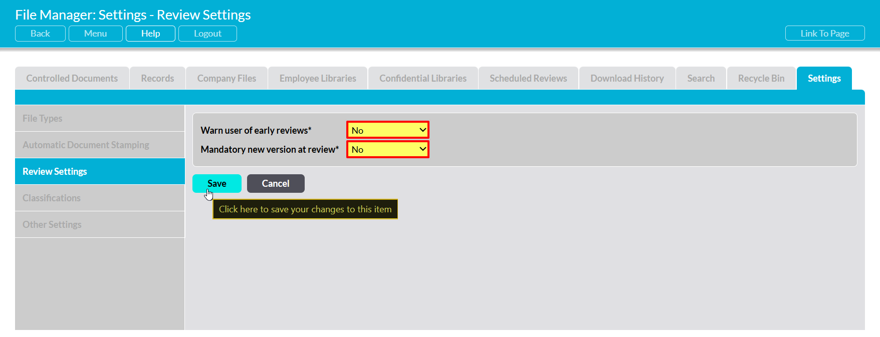 By default, both settings are disabled within your system. To enable them, select the Review Settings item from the left-hand menu, and then click Edit.