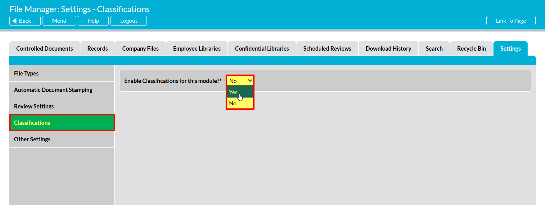 By default, the file classification feature is disabled. To enable it, select the Classifications menu item from the left-hand menu and change Enable Classifications for this module?* to ‘Yes’.