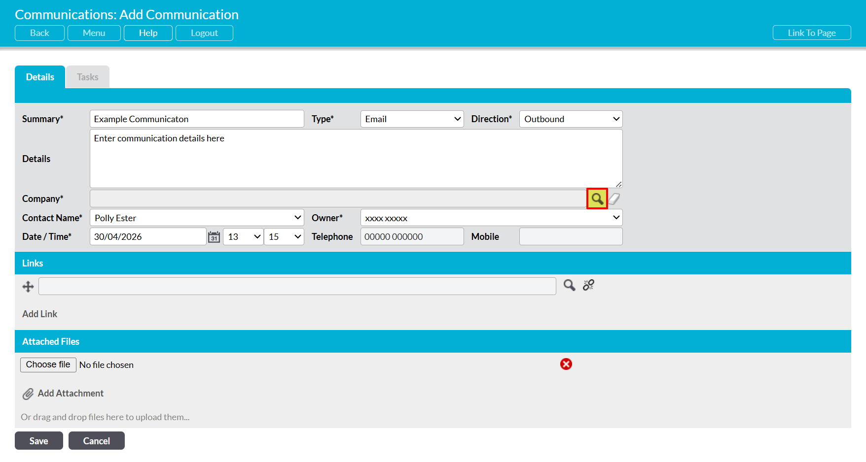 Note that all Communications must be associated with an existing third-party company and a contact that is recorded against that company. If you want to record a Communication against a new company or contact you must first create the company and contact within the Customers & Suppliers: Companies and Customers & Suppliers: Contacts areas. (See Add a Company and Add a Contact).