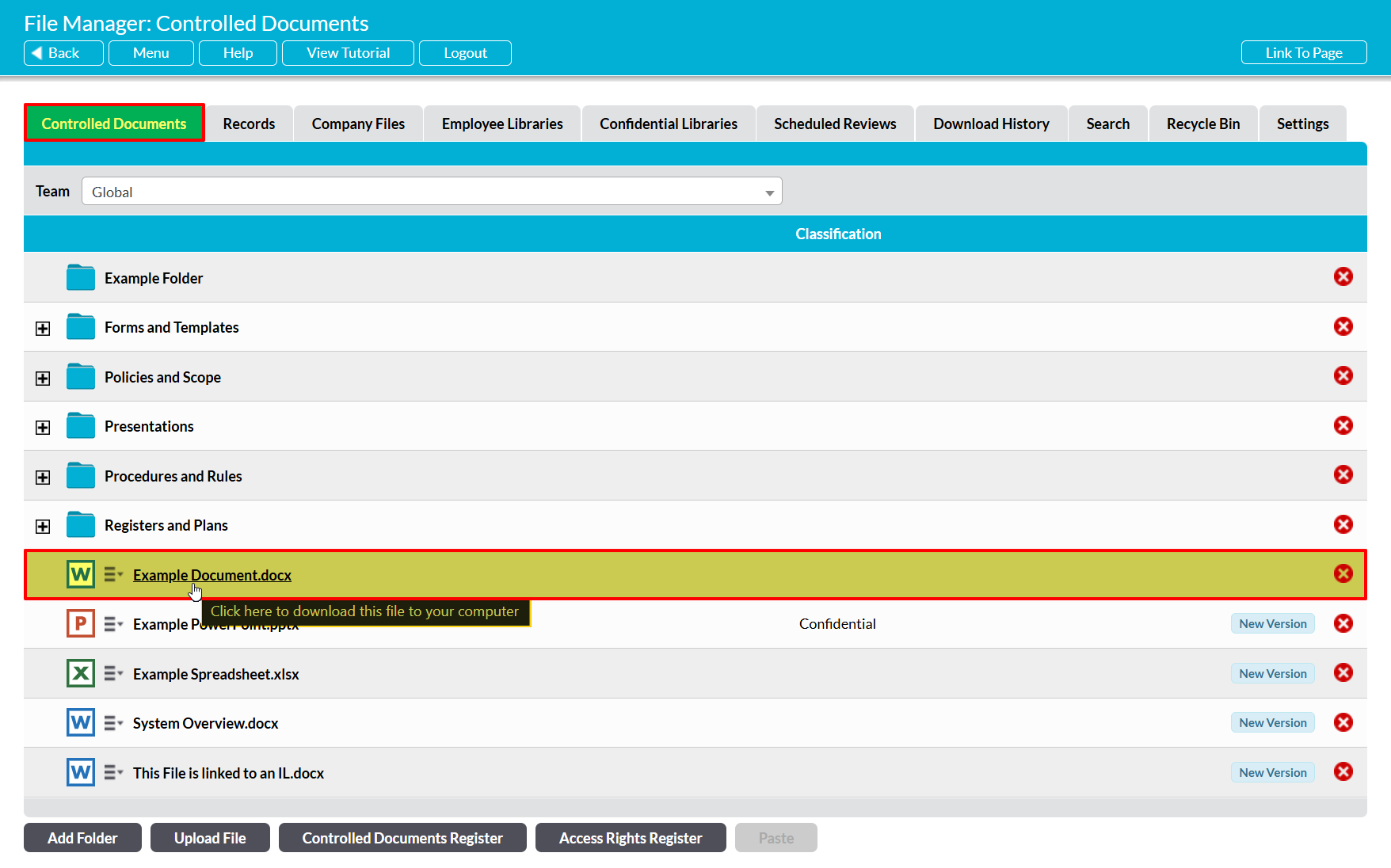 If your Registers’ Primary File Behaviour is currently set to ‘Download’ (the default setting for all new systems), then you can download a file by locating the file’s record within the appropriate register and then clicking on its name.