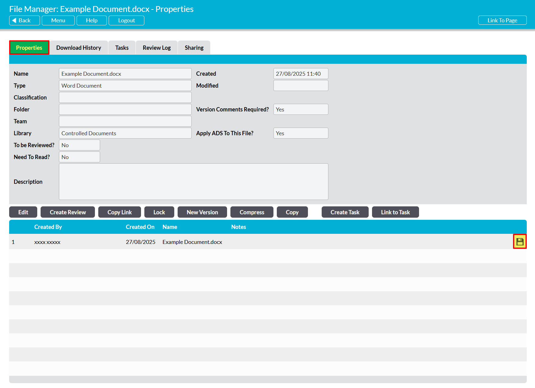 To download a file from the properties page, open it on its Properties tab (see View a File’s Properties) and click on the Floppy Disk icon to the right of the version you wish to view.