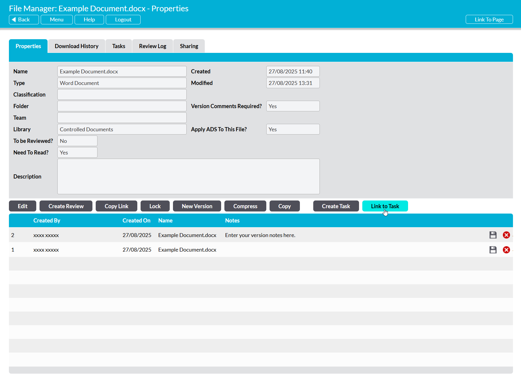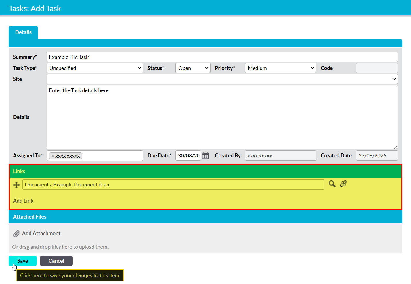 You will be returned to the file’s Properties tab, and the file will now be displayed in the Links section of the chosen Task(s). In addition, the Task(s) themselves will be recorded on the file’s Tasks tab.
