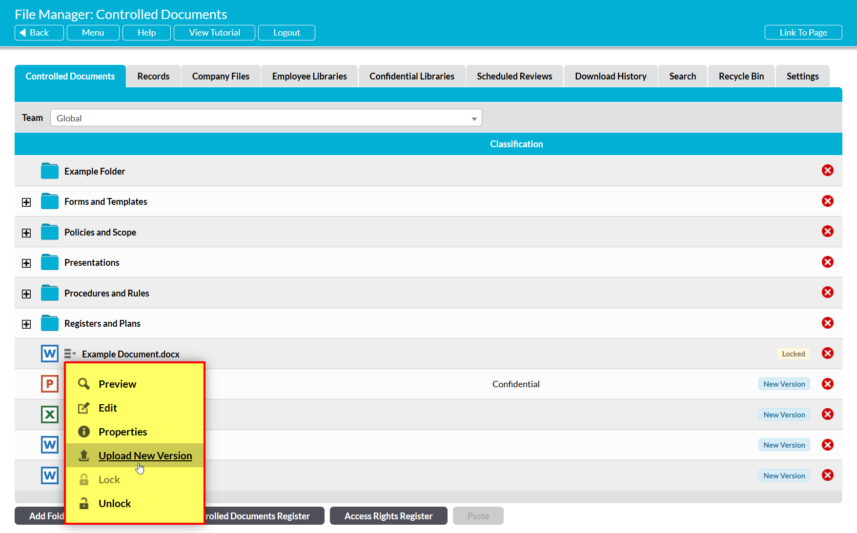 To enable you to maintain a detailed audit trail of changes made to your files, Activ automatically tracks version control information every time you upload a file as a new version of an existing file. This information is recorded within a file’s Properties tab, allowing you to store one copy of each file in your system whilst maintaining access to, and a record of, all previous versions. This feature is available across all File Manager Libraries and should be your default choice when updating existing files.