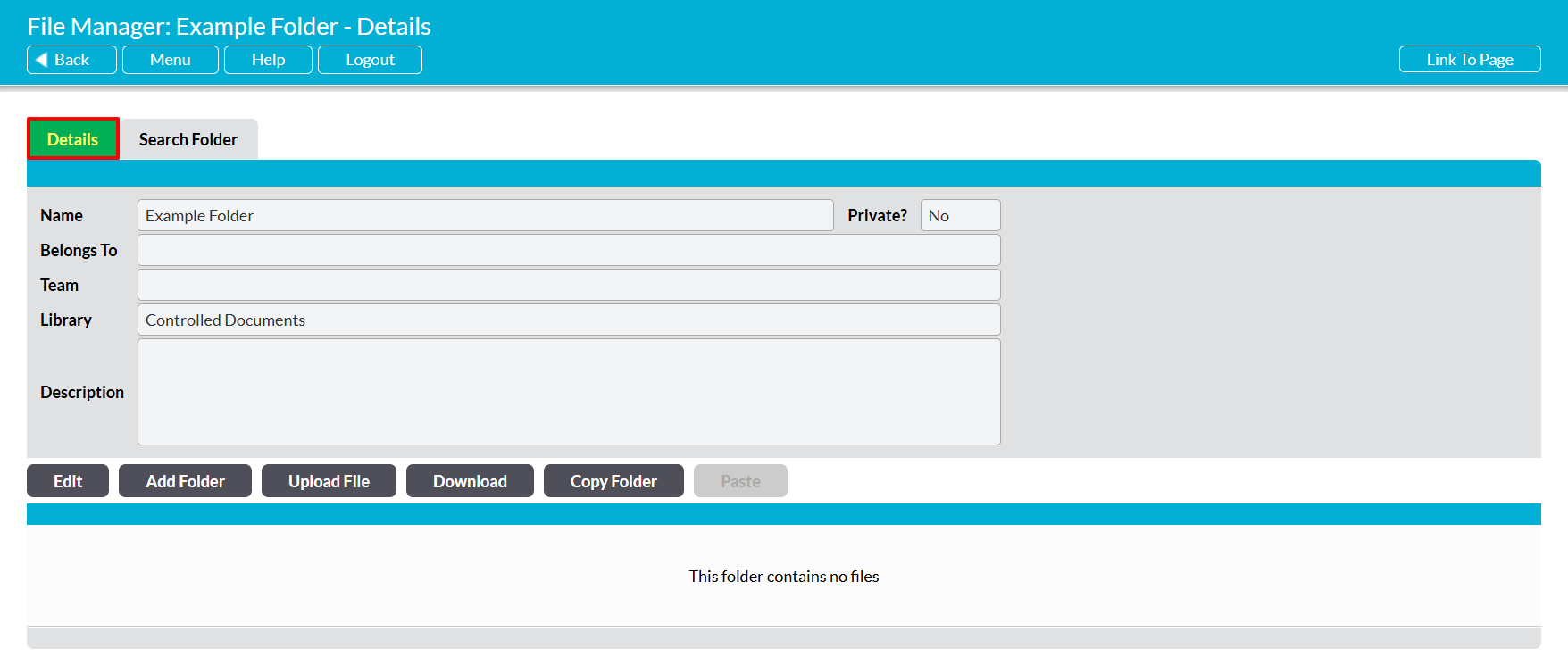 To view a folder’s properties, open the File Manager module and navigate to the appropriate Library (e.g. Records). All folders within the Library will be organised alphanumerically, with those prefixed by a number displayed first. Locate the appropriate folder in the file structure and click on its name.