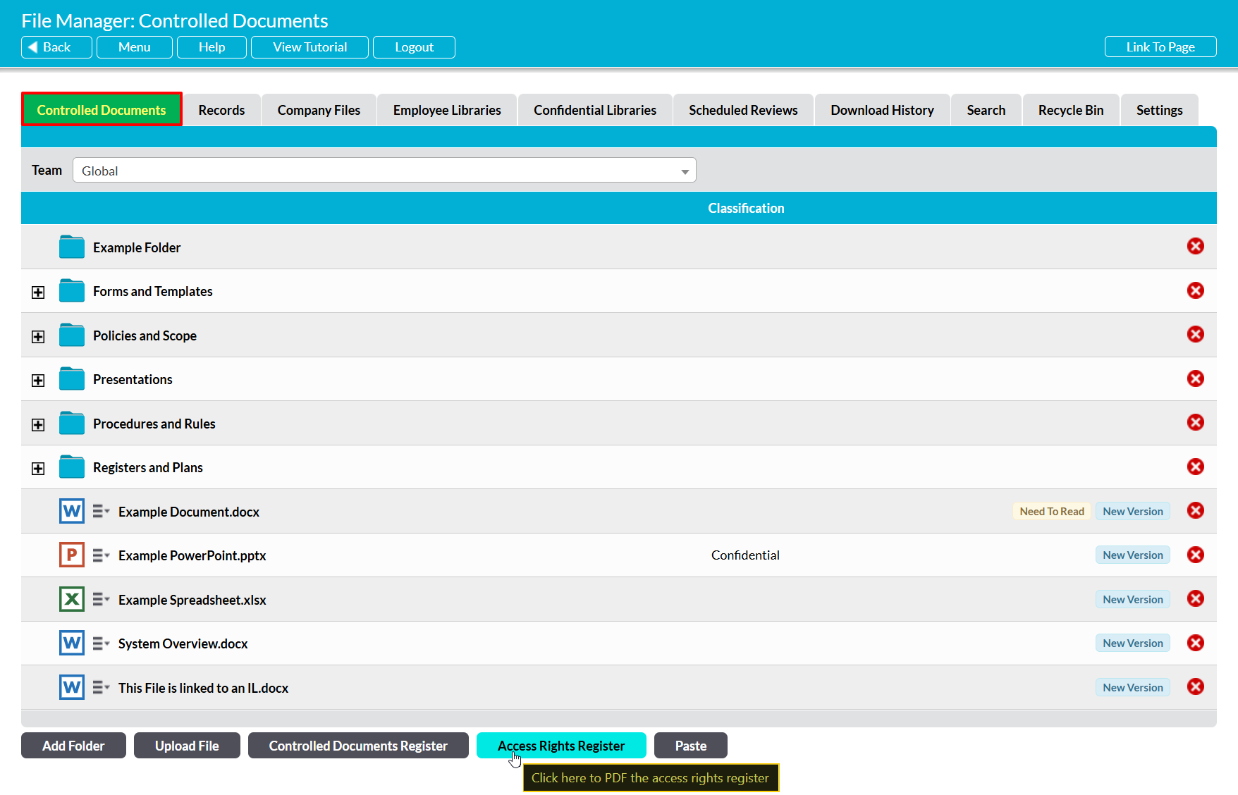To generate an Access Rights Register, navigate to the appropriate Library within your system and click on the Access Rights Register button at the bottom of the screen.